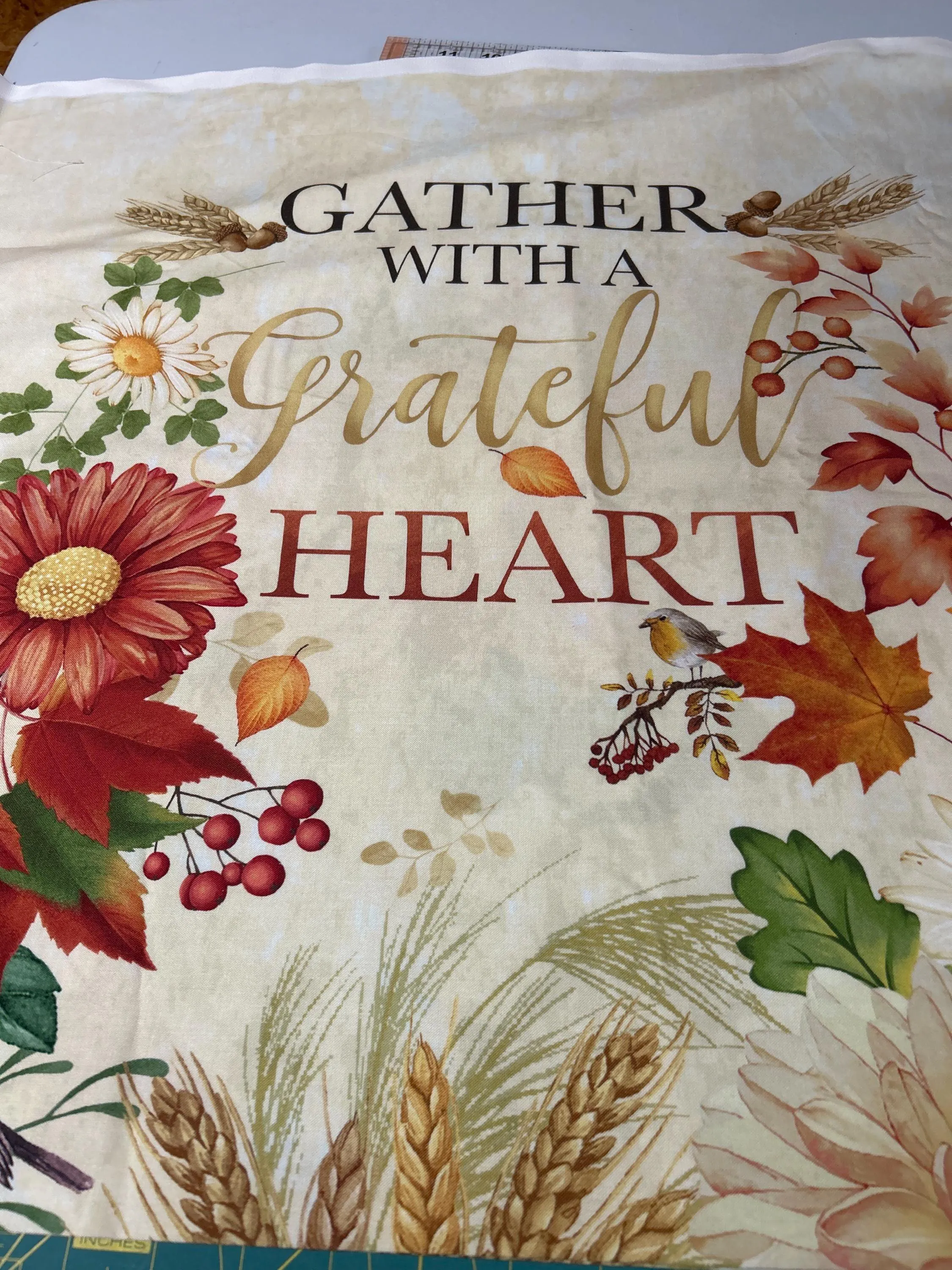 This fabric features a heartwarming design with the phrase "Gather with a Grateful Heart" prominently displayed in elegant script. Surrounding the text is a beautiful autumnal arrangement of pumpkins, flowers, and leaves in vibrant hues of orange, red, and yellow, creating a festive and inviting look perfect for fall-themed projects. The design is framed by a delicate border of wheat and floral elements, adding a touch of rustic charm.