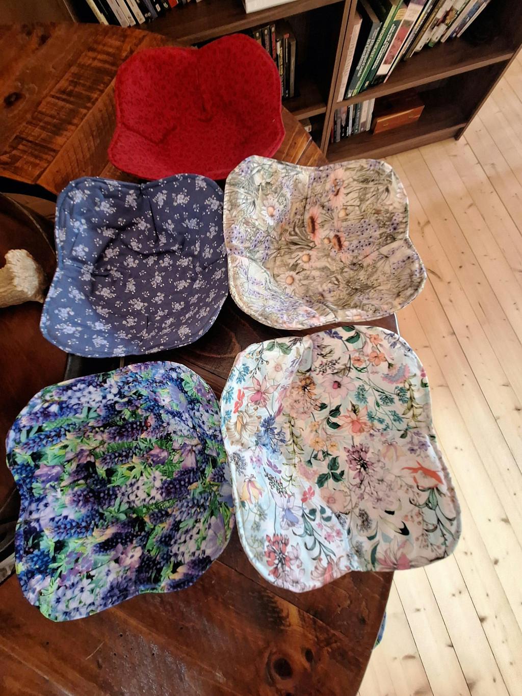 Instructions: Place pre-cut batting on the wrong side of a 10.5 inch square of cotton fabric. Using 100 % cotton thread, fold and stitch darts 1/4 inch away from the batting cut edge. Trim out fabric excess. Repeat with second square of cotton and pre-cut batting. Put right sides together and stitch around the outer edge. Leave an opening for turning. Turn and stitch the opening closed.