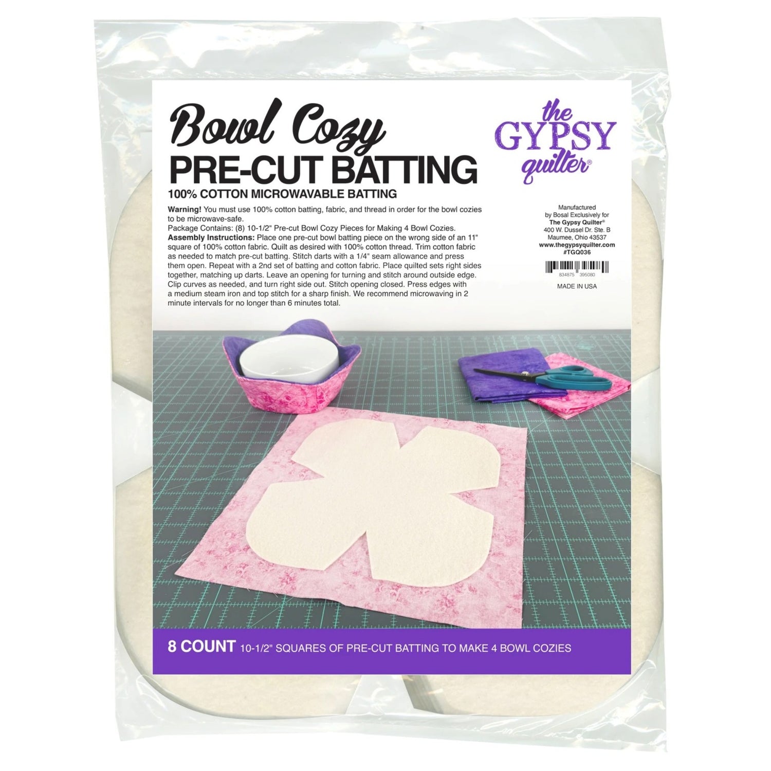With this project you MUST use 100% cotton thread and 100% cotton fabrics ONLY. 100% cotton pre-cut batting to make a microwave bowl cozy. Made in the USA